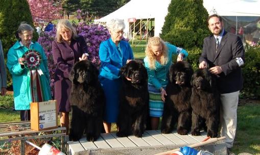 | The Tempest Newfoundlands celebrate winning the NCA's First Ever Breeder's Class - look at the giant ribbon! Pictured from left to right: Judge Sylvia Hammarstrom Bodhi - CH Tempest's Kilyka Bodhisattva CD, DD, WD handled by Ingrid Lyden Finley - CH Tempest's First Draft Kilyka CD, TDD handled by Betty McDonnell Mark - Tempest's Mollybrook's Watermark handled by Karen Friedman Shelby - CH Tempest's Kilyka Girl Next Door handled by Steve Petsch |